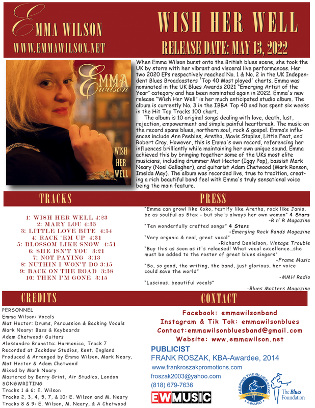 When Emma Wilson burst onto the British blues scene, she took the UK by storm with her vibrant and visceral live performances. Her two 2020 EPs respectively reached No. 1 & No. 2 in the UK Independent Blues Broadcasters 'Top 40 Most played' charts. Emma was nominated in the UK Blues Awards 2021 “Emerging Artist of the Year” category and has been nominated again in 2022. Emma's new release “Wish Her Well” is her much anticipated studio album.
