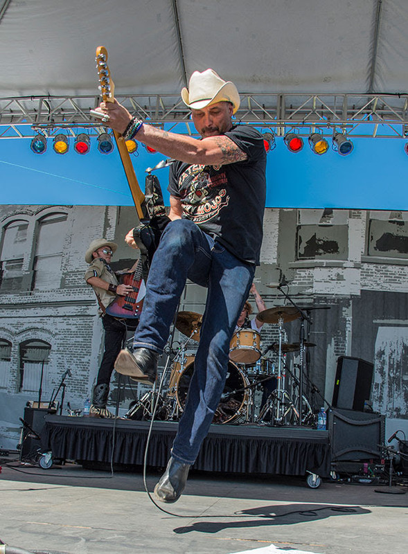 Onstage, Tim "Too Slim" Langford leaps into action, backed up by Zach Kasik on bass and Jeff "Shakey" Fowlkes on the drums. Needless to say, the amped-up festival audience goes wild! According to Tim, playing for a huge crowd is the "F'ing best feeling ever!! Very exhilarating! Personally, I'm at my best when you get the feeling back from the crowd.