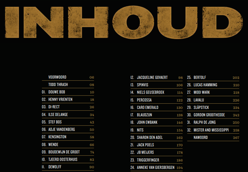 Met verhalen van: Boudewijn de Groot, Caro Emerald, Kensington, Di-rect, JB Meijers, Triggerfinger, Niels Geusebroek, Henny Vrienten, Douwe Bob, Ralph de Jong, Nits, Stef Bos, Blaudzun, Jacqueline Govaert, Wende, Tjeerd Oosterhuis, Bertolf, Anneke van Giersbergen, Släpstick, Percossa, Gordon Groothedde, Lucas Hamming, LAVALU, Spinvis, DeWolff, John Ewbank, Sharon den Adel, Mooi Wark, Mister and Mississippi, Ilse DeLange, Adje Vandenberg, Jack Poels