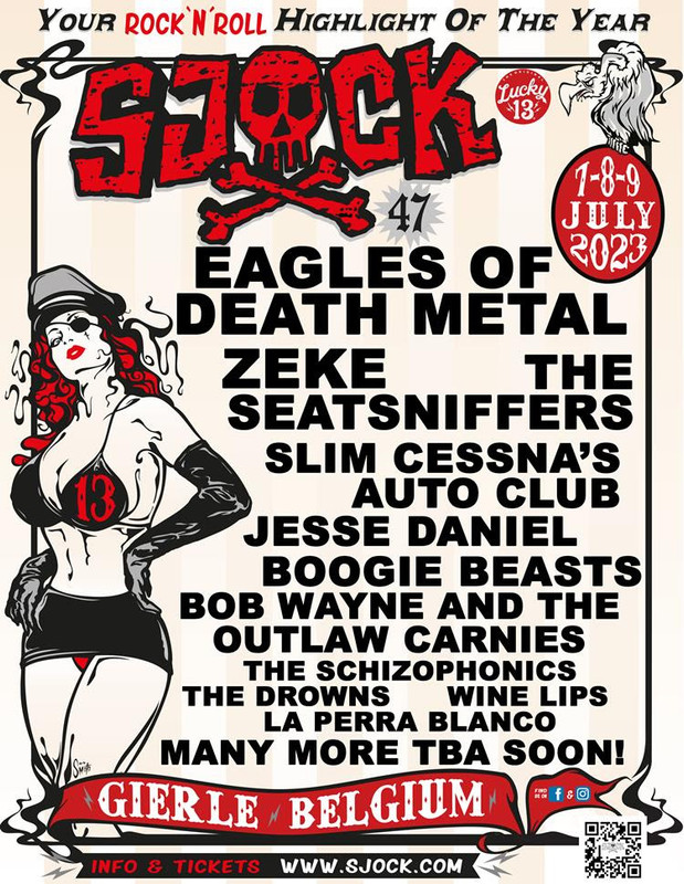 Eerste 11 namen voor Sjock festival (BE) op 7, 8 en 9 juli 2023 - o.a. Eagles of Death Metal (US), Zeke (US), The Seatsniffers (BE) en Bob Wayne (US); Early Bird combitickets vanaf nu te koop