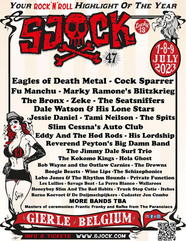 Met de toevoeging van lucky thirteen acts is het affiche voor de 47e editie van het gemoedelijke en eigenzinnige Sjock (BE) - dat op vrijdag 7 juli, zaterdag 8 juli en zondag 9 juli 2023 op festivalterrein Poeyelhei Gierle plaatsvindt - nagenoeg volledig.
