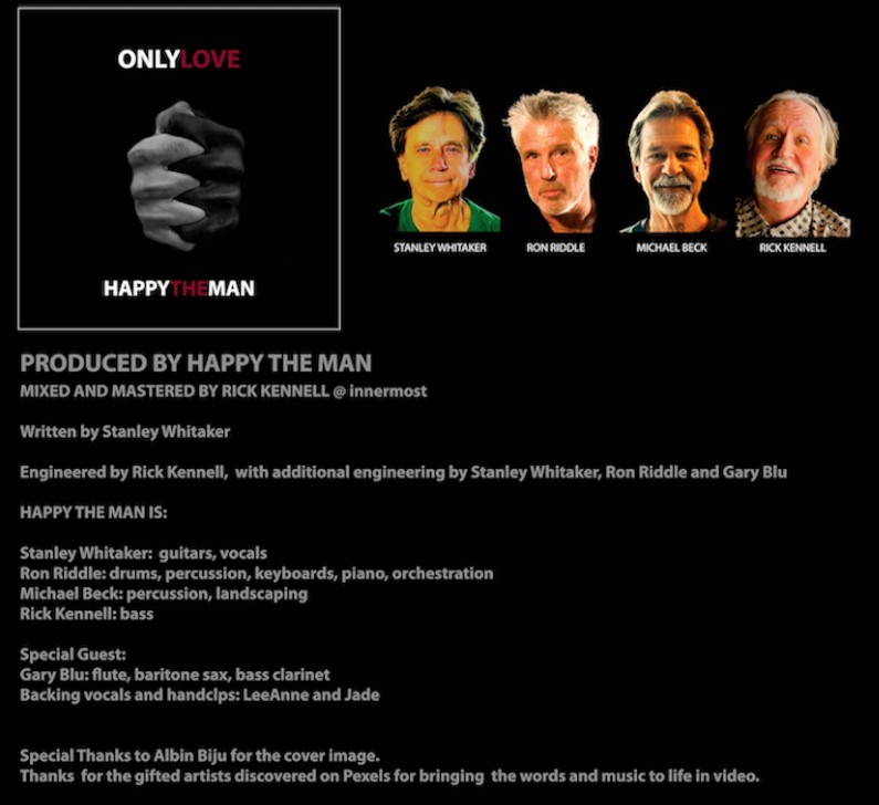 Says Stanley Whitaker, “The basic concept was to not only express my frustration and sadness in the world while shedding light and awareness. In late August 2020, while in a deep meditative state, I wondered what John Lennon would say about the state of affairs in America. I craved his voice and message and prayed for inspiration. In a blast of energy, I wrote over ten pages of lyrics and spent the next two weeks editing and laying down musical ideas. Recently, our former bandmate, Frank Wyatt, passed away on January 10, 2023, and the following morning, I awoke to, ‘Now it’s time to put HTM back together.’ Gobsmacked! I called Rick, Ron, and Michael, and everyone was on board to reunite as Happy the Man. All of the music was developed remotely from our studios across the country.”