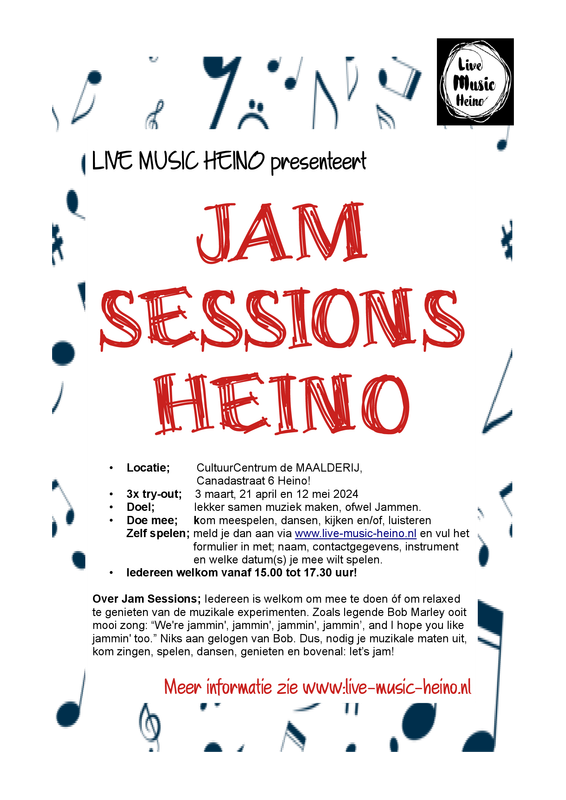Jamsessions HeinoDit projectplan is ontstaan op initiatief van Ruud & Arend en biedt een algemeen kader voor het organiseren van Jamsessions in CultuurCentrum De Maalderij in Heino onder de vlag van Stichting Live Music Heino. Het projectplan zal waar nodig aangepast worden op basis van de specifieke behoeften, kenmerken en ervaringen lopende de organisatie en uitvoering van de try-out fase. Doe mee; kom meespelen, dansen, kijken en/of, luisteren! Zelf spelen; meld je dan aan via www.live-music-heino.nl en vul het formulier in met; naam, contactgegevens, instrument en welke datum(s) je mee wilt spelen. |
