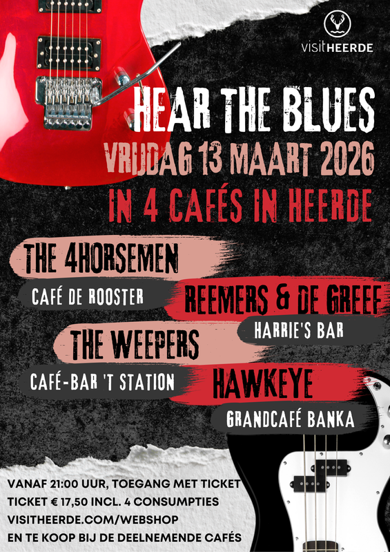 Hear the Blues op vrijdag 13 maart 2026 belooft niet alleen een avond vol muzikale ontdekkingen te zijn, maar ook een kans om samen te komen en te genieten van de gezelligheid die Heerde te bieden heeft. Mis deze unieke gelegenheid niet om de blues te voelen en te ervaren zoals nooit tevoren! Koop nu je tickets online in de webshop van Visit Heerde via visitheerde.com/webshop of bij één van de deelnemende cafés: Café-Bar ’t Station, Grand Café Banka, Harrie’s bar en Café De Rooster. Volg Hear the Blues op Facebook en blijf op de hoogte van blues in Heerde!