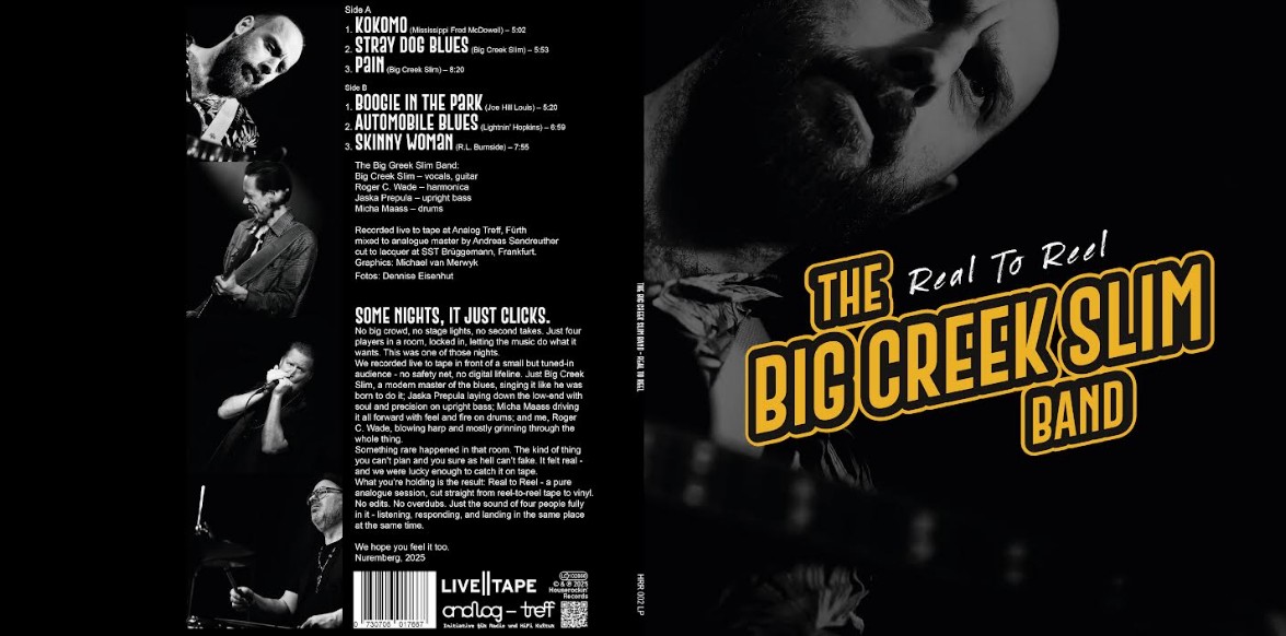 Recorded live at analog-treff in Nuremberg – no computers, no plugins, no post-fix – this album captures The Big Creek Slim Band as they truly are: live, loose, and locked-in. The tape was rolling, the red light was on, and what you hear is exactly what happened – every groove, every howl, every breath.