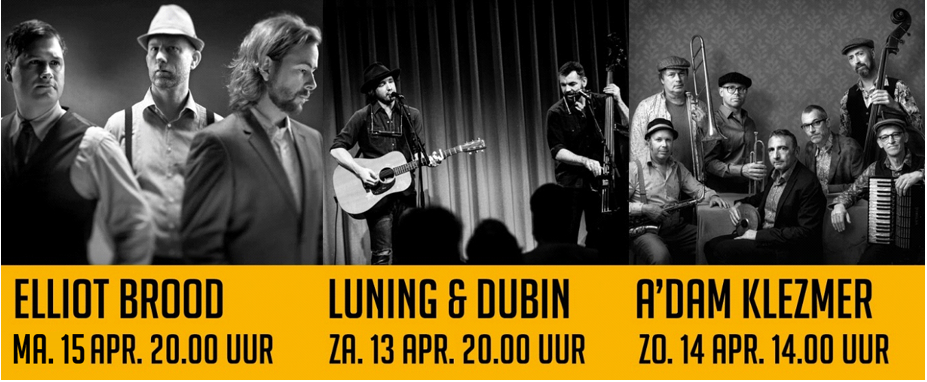 Een weekend met een mix van verschillende muziekstijlenEen gevarieerd programma dit weekend met alt-country van Elliot BROOD, country, folk en americana van David Luning & Ben Dubin en klezmer, balkan en gypsy van de Amsterdam Klezmer Band. Voor meer details zie ook Digitaal Programma Café De Amer