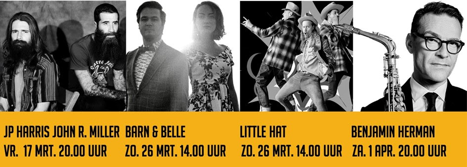 We vragen speciale aandacht voor een aantal bijzondere muzikanten. Gewoon, omdat we soms zelf verbaasd zijn welke opmerkelijke artiesten we op ons bescheiden podium mogen ontvangen. Op vrijdag 17 maart begroeten we JP Harris & John R Miller, zondag 26 april zien we Barn & Belle en Little Hat en we kijken ook uit naar het optreden van Benjamin Herman op zaterdag 1 april. Stuk voor stuk toppers die we hier uitlichten.