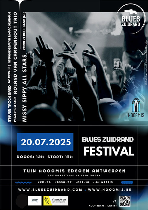 Belgian Blues Federation Blues Zuidrand Festival Graag vestigen we uw aandacht op het festival, georganiseerd door Blues Zuidrand, 'gold member' van de Belgian Blues Federation (BBF) en tevens de partner met wie we samenwerken voor de Belgian Blues Challenge 2025. Het Blues Zuidrand Festival vindt plaats op zondag 20 juli 2025 in de tuinen van Brouwcafé Hoogmis in Edegem (Antwerpen). Het programma vangt aan om 13.00 u. en herbergt enkel toppers uit de Benelux-bluesscene......►►► |