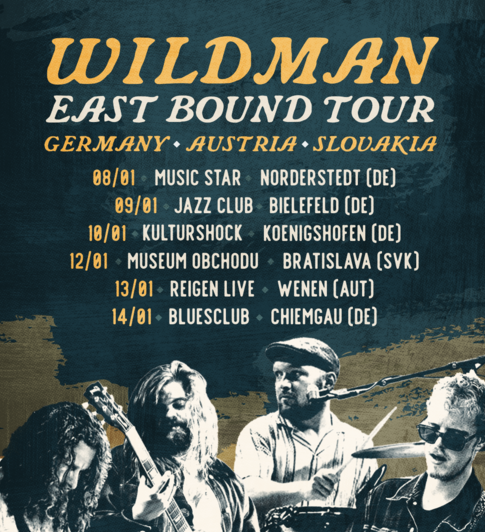 Laat je meeslepen door de rauwe energie van Wildman’s pompende garage rock. 4 jonge heren die geïnspireerd zijn geraakt door de grootheden uit de 70s en dit naadloos doorvertalen naar tijdloze songs. Zo ontstaat een eigentijdse zweterige 70s sound die naast blues en rock liefhebbers een breder publiek aanspreekt. Bereid je voor op een rauwe stem, onweerstaanbare hooks en een lawine van scheurende gitaren en Hammond orgel......